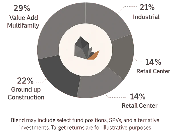 Investments in opportunistic real estate projects in multiple sectors, consisting of Value add and development strategies. Our portfolio strategy aims to democratize access to exclusive investment opportunities traditionally reserved for institutional-grade investors.